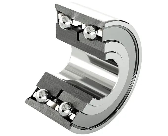 Duplex Bearings are matched bearings that provide accurate alignment in radial and axial directions. These bearings are designed to eliminate vibration and offer a higher load capacity, leading to longer life and increased system reliability. Duplex bearings are matched by loading every single bearing with the desired preload, measuring the axial offset, and grinding the relevant ring face. When assembled as a set, these bearings create a precise sub-assembly with a known preload, offering increased load capacity, a stiffer assembly, and optimised life.