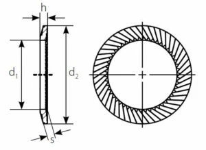 The Schnorr safety washers are in the form of a disc spring which is serrated on both sides and of trapezoidal cross section. Schnorr washers are engineered to match screw dimensions precisely. The outer diameter of the washer is matched to the head diameter of pan-head and hexagon socket head cap screws.
